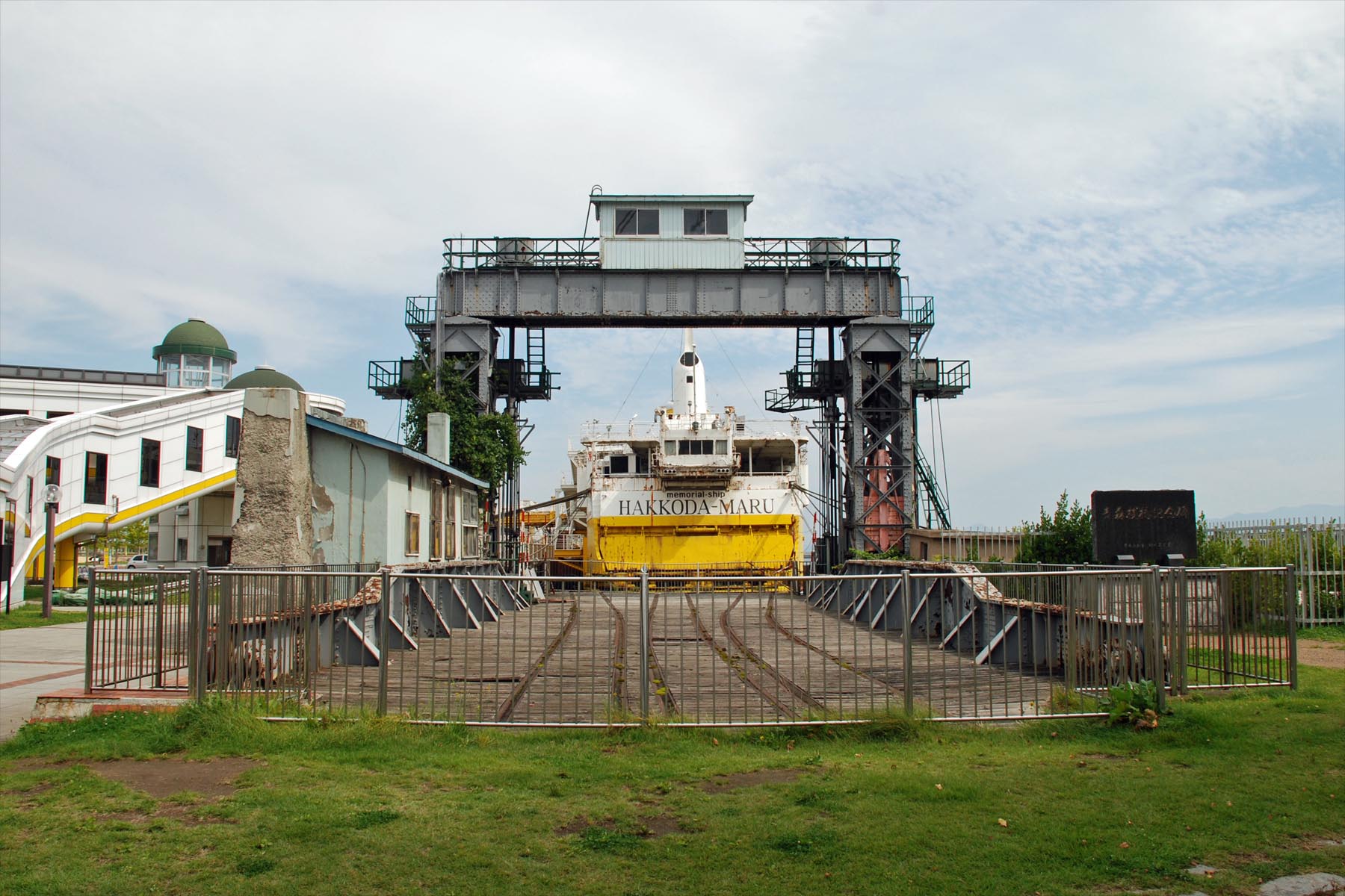 第2岸壁に保存された青函連絡船の車両搬入口と線路をつないでいた可動橋