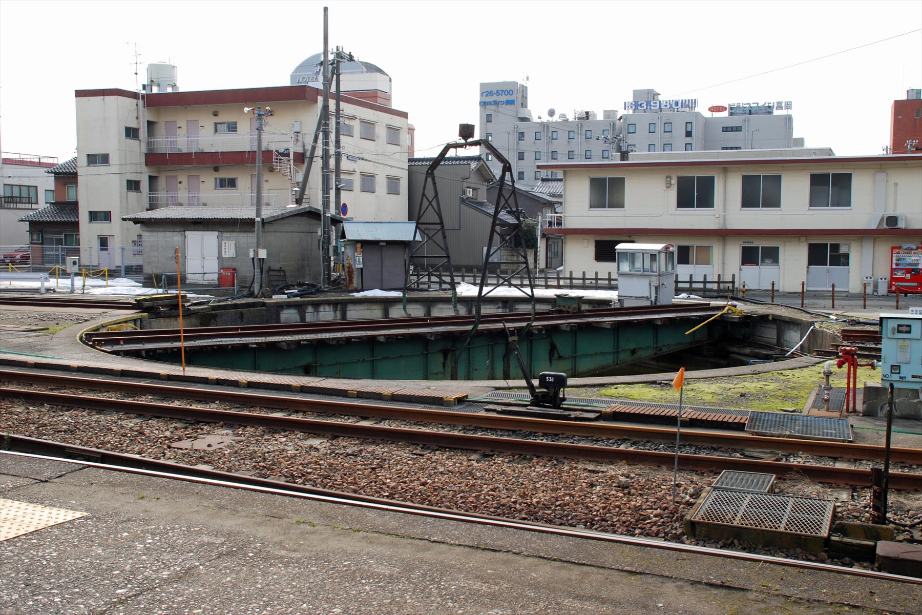 高岡駅構内の上路式転車台 転車台手前に枕木の車止めが設置されているので