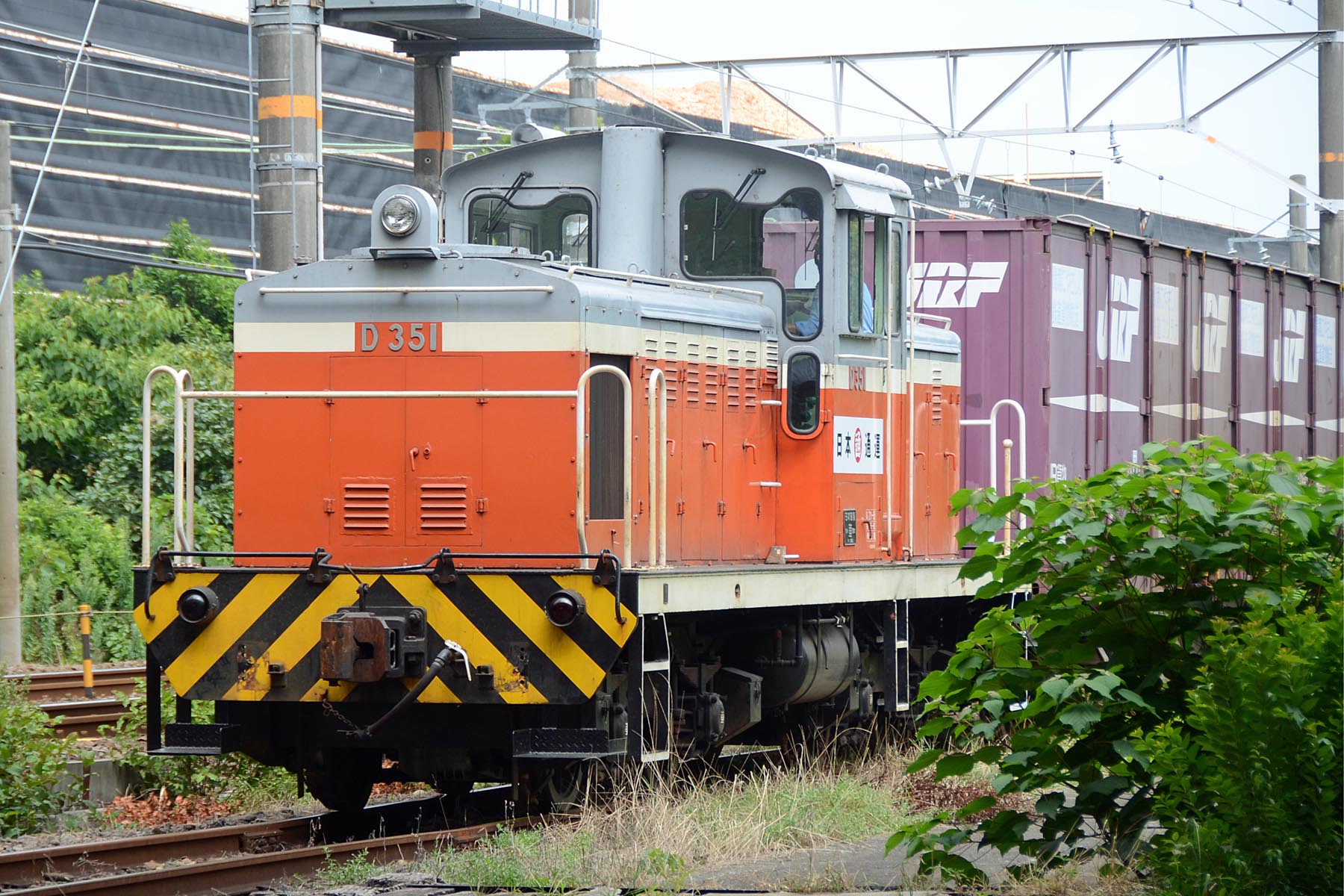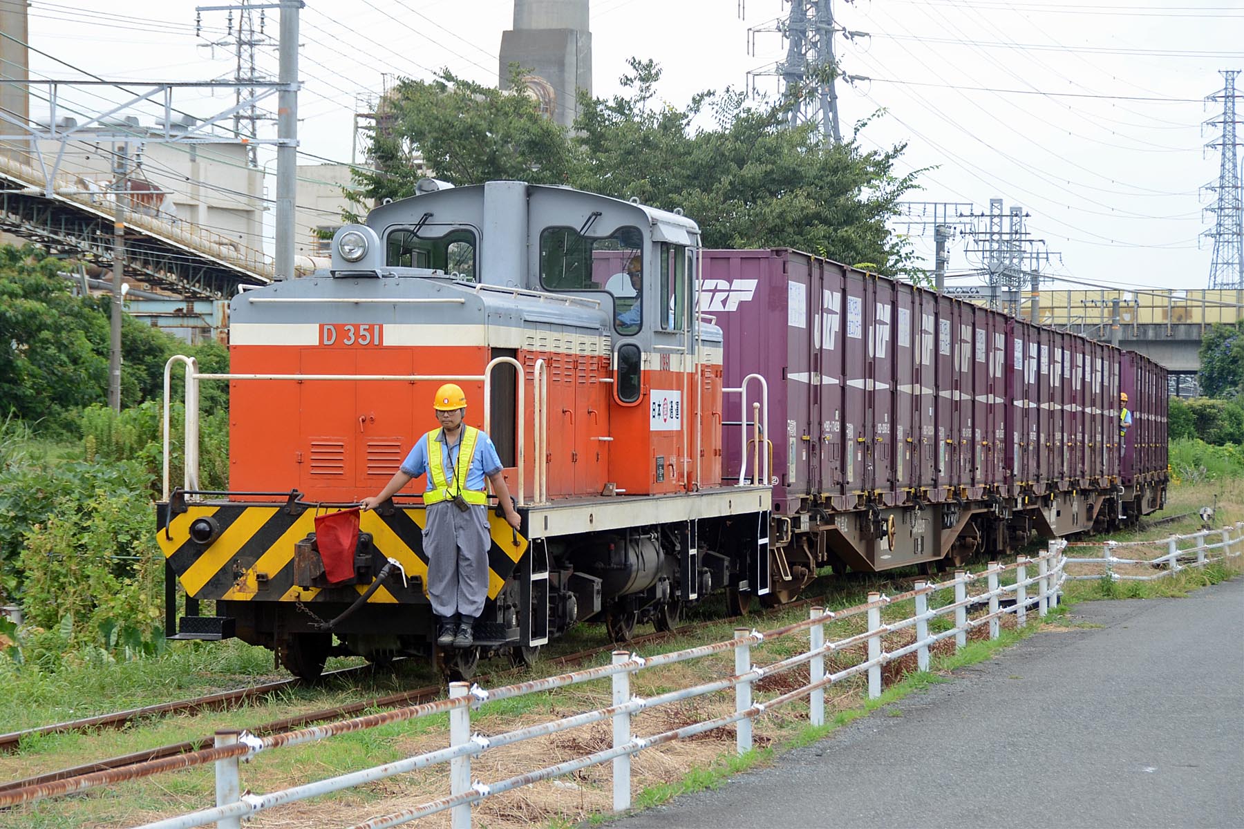 日本製紙富士工場 2025/11/12 試験・試運転, 貨物専用線 ◆2012-08-10 日本製紙富士工場専用線の午後の出荷便 伏木から転属してきたD351がコキ3両を牽引して出てきました 復路もコキ3両を推進して工場へ帰っていきました 試9464D キヤ95系(DR1編成) 東海道本線 富士